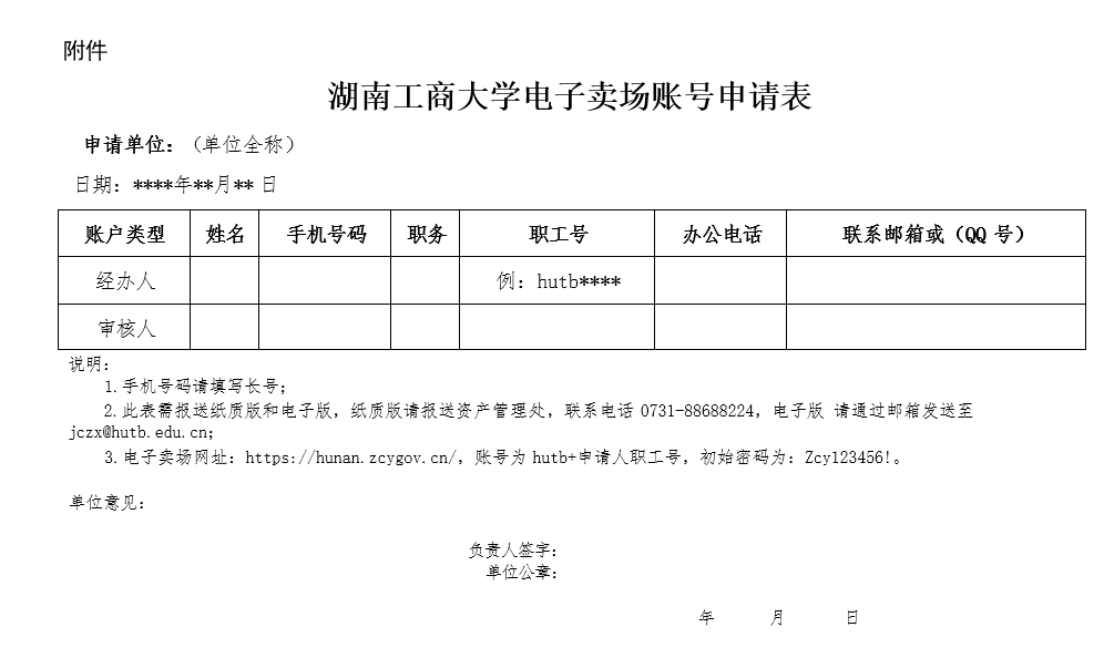 账号配置的申请:预算单位负责人填写《湖南工商大学电子卖场账号申请表》(见附件),账号申请表的纸质版加盖部门公章后报送资产管理处备案留存。